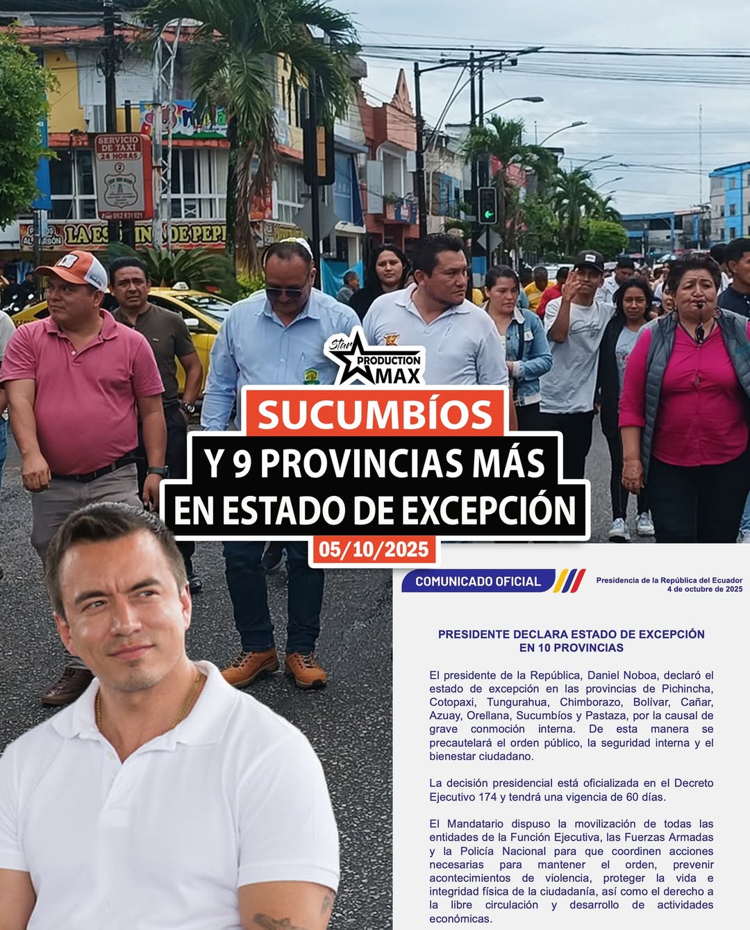 El presidente de la República Daniel Noboa, declaró estado de excepción en las provincias de Pichincha, Cotopaxi, Tungurahua, Chimborazo, Bolívar, Cañar, Azuay, Orellana, Sucumbíos y Pastaza, por la causal de graves conmoción interna.